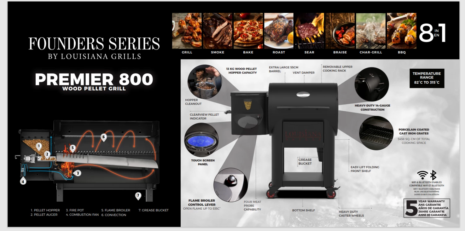 The Founders Series Premier 800 by Louisiana Grills® is a distinguished grilling machine designed to raise the standard of your backyard culinary experience, beautifully combining the legacy of pellet grilling with the technology of today. An homage to our founder and pellet grill visionary, Dan Thiessen, these grills feature upscale, stylish designs blended with a reawakening of performance and innovation. The Founders Series represents over 20 years of an unyielding passion for excellence, an unrivaled dedication to the pellet grill industry, and an endless devotion to the craft of high-end outdoor cooking. For those who want the best, look no further than the Founders Series by Louisiana Grills®.