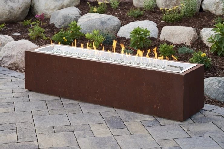The Outdoor Greatroom Cortlin Gas Fire Pit Table features a Corten Steel-look base made from durable stucco and HardieBacker® Cement Board. This contemporary gas fire pit is easy to care for and easy to use. The extra long 12×64″ Crystal Fire® Plus Burner is UL listed for safety and set in a modern low-profile base.