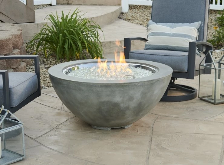 The Outdoor Greatroom Cove Collection is the perfect addition to any contemporary outdoor space. The White Supercastâ„¢ concrete lets the focus be on the stunning 30″ Round stainless Steel Crystal Fire® Plus Burner. The organic, natural appearance of the concrete is unique to each unit and color variations and wear are common attributes to the beauty of the fire bowl.